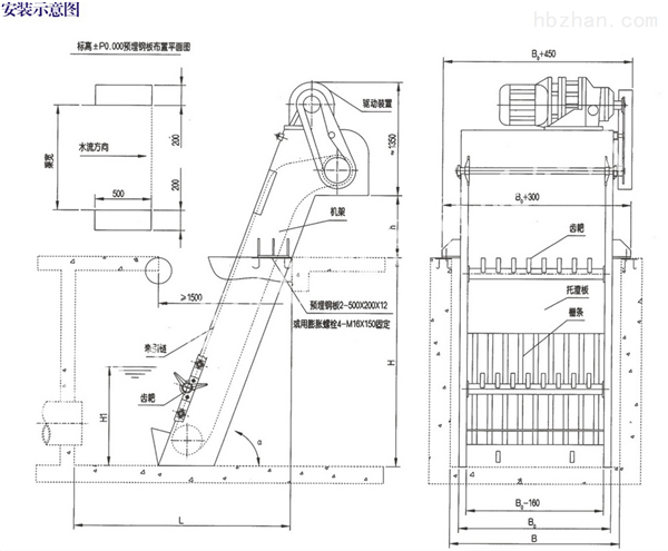 按水流方向耙齒鏈類(lèi)同于格柵,在耙齒鏈軸上裝配的耙齒間隙可以根據(jù)使用條件進(jìn)行選擇。當(dāng)耙齒把流體中的固態(tài)懸浮物分離后可以保證水流暢通流過(guò)。整個(gè)工作過(guò)程是連續(xù)的,也可以是間歇的。